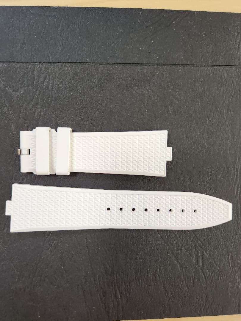 新品で購入したデイトナ(126515LN)から取り外した物です。再度、サイズの変更が必要になる可能性を考えて、しばらく保管していましたが、今のサイズで問題なさそうなので、出品しました。9〜10枚目は、同じ条件で撮影した、利用している時計に付けている使用済みの写真のため、出品内容には含まれません。先ずFというのは、バンド片側に対するサイズで、片側のみの出品です。最短のD〜Hまで、5段階のサイズがあり、長さの違うバンドを組み合わせ、12時側に長いバンドを持ってくる必要があるらしく、同じアルファベット2つ組み合わせる事は、基本的にはないようです。自分の場合は、出品しているFと、今も使っているEが元々装着されていたバンドで、Fが12時側、Eが6時側に付いていました。購入したDよりも、元々6時側に付いていたEが長いため、Eを12時側、短い方のDを6準備側に装着してもらいました。| カテゴリー: | ファッション>>>時計>>>ラバーベルト |